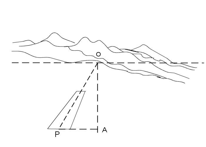 Figure1 : sans les limites de la piste dont les bords sont horizontaux, et sans les pointillés, l’horizon apparent peut se confondre avec la pente générale du sol. L’avion est aligné quand PO se confond avec AO.